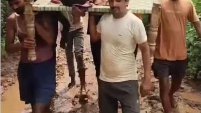 मैहर में बदहाल व्यवस्था: सड़क न होने के कारण एंबुलेंस नहीं पहुंची, ग्रामीणों ने खाट को बनाया स्ट्रेचर