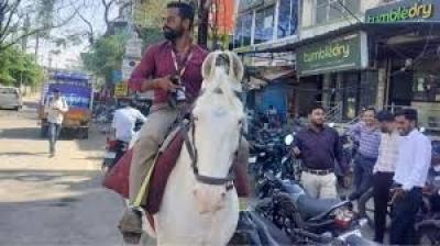 देवास में जुगाड़ का कमाल, घोड़े पर बैठकर ऑफिस पहुंचा बैंक कर्मी