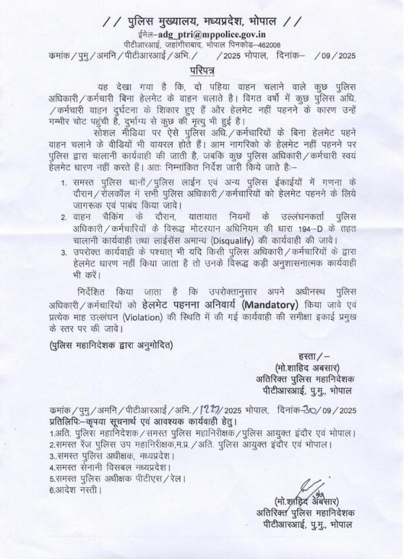 मध्य प्रदेश पुलिस मुख्यालय द्वारा जारी आदेश में दो पहिया वाहन चलाते समय पुलिसकर्मियों को भी हेलमेट पहनना अनिवार्य किया है. आदेश का उल्लंघन करने पर पुलिसकर्मियों पर भी मोटरयान अधिनियम की धारा 194डी के तहत चालानी कार्रवाई की जाएगी. इसके साथ ही बिना हेलमेट पकड़े जाने पर पुलिसकर्मियों के खिलाफ विभागीय कार्रवाई भी की जाएगी. यानि अब पुलिसकर्मियों पर भी हेलमेट नहीं पहनने पर आम जनता की तरह कार्रवाई होगी.